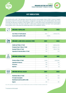 This factsheet provides an overview of the organic agriculture sector in Cyprus, including farmland area, market trends, and key figures on organic production. It also outlines CAP policy support, detailing financial allocations, eco-schemes, and strategic goals for organic farming. Additionally, it highlights national action plans and support measures for organic aquaculture and market development.