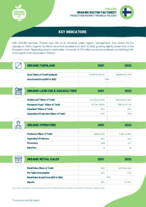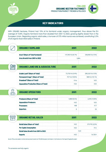 This factsheet provides an overview of the organic agriculture sector in Finland, including farmland area, market trends, and key figures on organic production. It also outlines CAP policy support, detailing financial allocations, eco-schemes, and strategic goals for organic farming. Additionally, it highlights national action plans and support measures for organic aquaculture and market development.