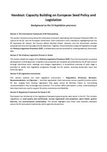 The handout provides a comprehensive overview of how EU legislation is developed, with a focus on seed policy. It first explains the roles of the main EU institutions: the European Parliament, which represents EU citizens; the Council of the EU, representing member states; and the European Commission, which proposes new laws. These bodies work together through the Ordinary Legislative Procedure (OLP), a collaborative process that ensures laws are democratically debated, amended, and adopted.