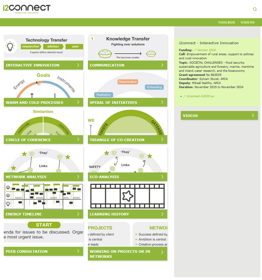 | What solution does the tool offer?: | The i2connect project aims to enhance advisors' skills in supporting interactive innovation processes. Various tools and methods are available for this purpose. To choose the right tool, consider the problem, context, and questions you face. Ultimately, supporting interactive innovation also requires the right mindset, focusing on relationship-building, and connecting people. All the tools are available on the project's website for testing and exploration. |