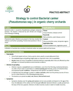 This InnOBreed practice abstract provides organic growers with a comprehensive strategy to recognize and manage bacterial canker caused by Pseudomonas syringae. The disease affects a wide range of stone fruits—including sweet and sour cherries, plums, apricots, and peaches—as well as occasionally pome fruits. The susceptibility of trees is highly influenced by rootstock choice, tree vigor, and environmental stress, making orchard design and maintenance key to prevention.