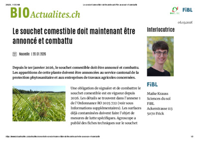 Krauss, Maike (2026) Le souchet comestible doit maintenant être annoncé et combattu. Institut de recherche de l'agriculture biologique FiBL, CH-Frick . Online at https://www.bioactualites.ch/actualites/nouvelle/le-souchet-comestible-doit-maintenant-etre-annonce-et-combattu, accessed on: March 2026.